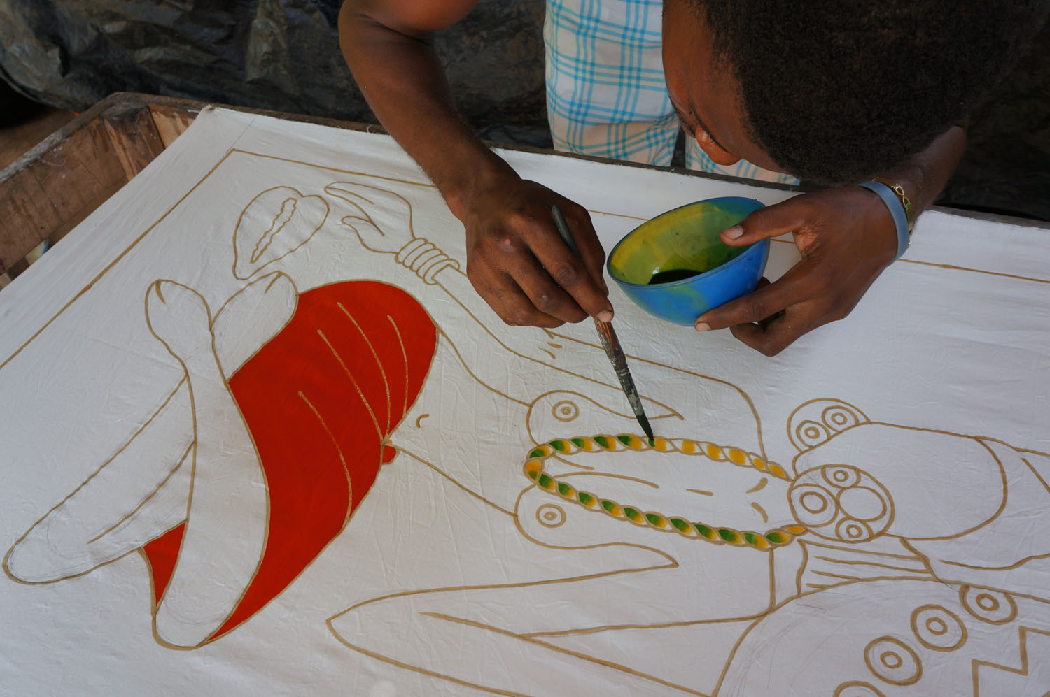 Le batik est un art de l’Afrique subsaharienne dont les origines remontent à un peu plus de mille ans. Il consiste à créer un motif avec de la cire fondue sur un tissu clair et de le teindre ensuite. Un grand nombre d'artisans perpétuent cet art dans des compositions narratives. Elles témoignes souvent de la culture africaine au travers des représentations liées aux animaux, aux traditions et aux scènes de la vie quotidienne des villages.